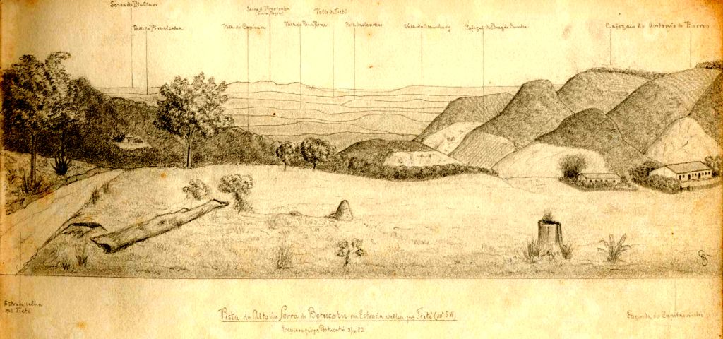 Abaixo, uma ilustração da Serra de Botucatu, onde se localizavam as maiores fazendas de café. Essa ilustração foi feita por um engenheiro, a serviço da Estrada de Ferro Sorocabana, num estudo para escolha do melhor lugar para subir a serra com os trilhos, que vinham chegando. Ele fez três viagens de prospecção 1882/1883/1884 e desenhou numa caderneta de campo, que hoje está arquivada na FAU, em S. Paulo. Ele se chamava Carlos Schimit. Digamos, guardadas as devidas proporções é o nosso Rugendas.