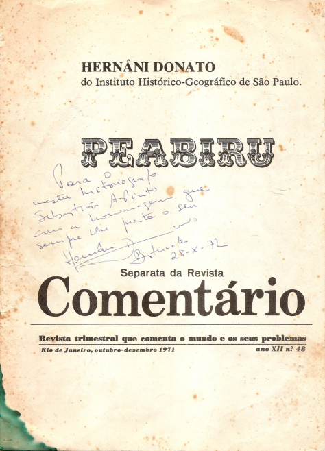 Hernâni Donato - Peabiru - Separata da Revista Comentário - Outubro-Dezembro 1971 O Caminho Peabiru sempre foi o tema preferido do romancista e grande historiador Hernani Donato. Em palestras, escritos ou conversas informais, seu carinho pelo tema revelava essa preferência. Falava dele com paixão de adolescente. Mesmo assim, ele empurrou até o fim da vida um projeto de percorrer e balizar o caminho outrora palmilhado por indígenas, bandeirantes e jesuítas, que se aventuravam pelo novo mundo, atravessando a Terra Brasilis de leste a oeste. Infelizmente não conseguiu levar a termo seu projeto. Porém, foi deixando marcas sobre o tema, aqui e ali, ao longo de tantas décadas que trabalhou com a história brasileira. Fui a um desses momentos, ainda na década de 1990, quando lançou seu livro “Sumé e o Peabiru”. Era uma pequena editora, uma tiragem pequena também, mas que já mostrava o tipo de abordagem que o romancista e historiador estava disposto a empreender. Esse livro, do qual restam poucos exemplares ainda em circulação, embora pequeno, foi suficiente para realimentar as gerações que vieram depois, curiosas com a misteriosa saga dos habitantes, e muitos aventureiros, que palmilharam nosso território em tempos imemoriais. Trabalhando sempre, foi tocando insistentemente no tema, deixando em outras publicações, verdadeiros ensaios, preâmbulos, do que pretendia fazer. Eis aqui, então, para que isso fique fixado e não se perca, e todos conheçam, um outro texto sobre o tema, publicado em separata da Revista “Comentário”, revista trimestral publicada no Rio de Janeiro, com data de outubro-dezembro de 1971, oferecido por ele, com dedicatória ao médico, professor e historiador botucatuense Sebastião de Almeida Pinto. CLIQUE AQUI para acessar o pdf…