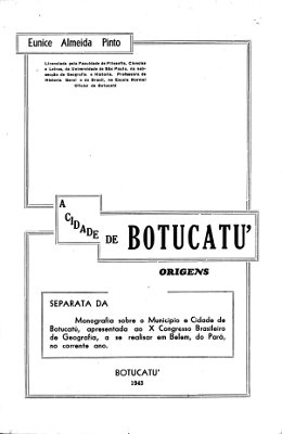 “A Cidade de Botucatu, origens”, de autoria da professora Eunice Almeida Pinto O ensaio que vem a seguir é uma das peças mais importantes sobre a história de Botucatu; quer pela sua precedência, quer pela sua abordagem com ênfase nos critérios de análise acadêmicos. Publicado como separata, originou-se da monografia sobre “o município e cidade de Botucatu, apresentada ao Xº Congresso Brasileiro de Geografia, em Belém do Pará, no ano de 1943. Baseado em pesquisas nos arquivos do Colégio São Luiz (jesuíta) e do Arquivo do Estado, a autora, professora Eunice Almeida Pinto, recupera os detalhes da ocupação do território e estabelece pontos importantes a serem considerados quando se analisa o surgimento da cidade, concluindo com uma abordagem direta, fazendo “considerações sobre a origem da cidade de Botucatu”. Praticamente dá continuidade aos primeiros trabalhos do dr. João Nogueira Jaguaribe, buscando novos fundamentos para outras teses que passa a defender, nas quais revelou-se pioneira. Dada a sua importância e à importância da autora como ativista das letras e história local, esse opúsculo não poderia continuar desaparecendo da memória dos que se interessam pela cidade. A autora licenciou-se pelos departamentos de Geografia e História da Faculdade de Filosofia, Ciências e Letras da Universidade de São Paulo e foi professora de história e geografia na antiga Escola Normal Oficial de Botucatu (atual EECA) CLIQUE AQUI para acessar o pdf…