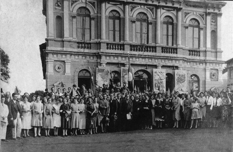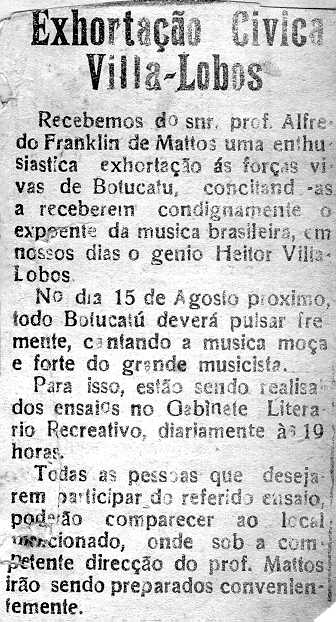 | Abaixo: A Caravana Villa-Lobos em Botucatu, em agosto de 1931, defronte ao Teatro Espéria. Ao centro: João de Souza Lima, Alfredo Franklin de Mattos, Heitor Villa-Lobos, Prefeito Leônidas Cardoso. Na extremidade esquerda: Prof. Nelson Franklin de Mattos (último), Prof. Sylvio Galvão (penúltimo), Professora Jair Conti (a quarta da esquerda para a direita). Esquerda: Notícia sobre a Caravana Villa-Lobos no Correio de Botucatu, em agosto de 1931. |
