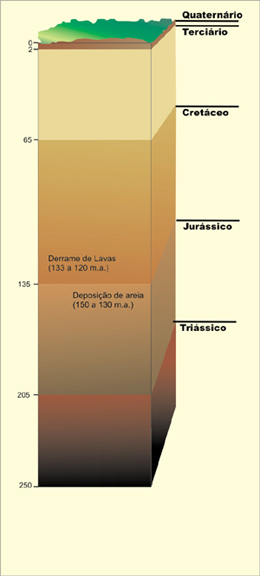Num período posterior, há 130 milhões de anos, já no período Jurássico, o deserto de areia, com suas dunas, foi coberto por colossais derrames de lavas incandescentes. Durante esse processo, através de violentos movimentos sísmicos, a crosta terrestre rompeu-se, lançando, pelas fendas abertas, das profundezas do Planeta, minérios derretidos. Já era um prenúncio das imensas fraturas que iriam dividir o megacontinente Gondwana, separando a América do Sul, da África.